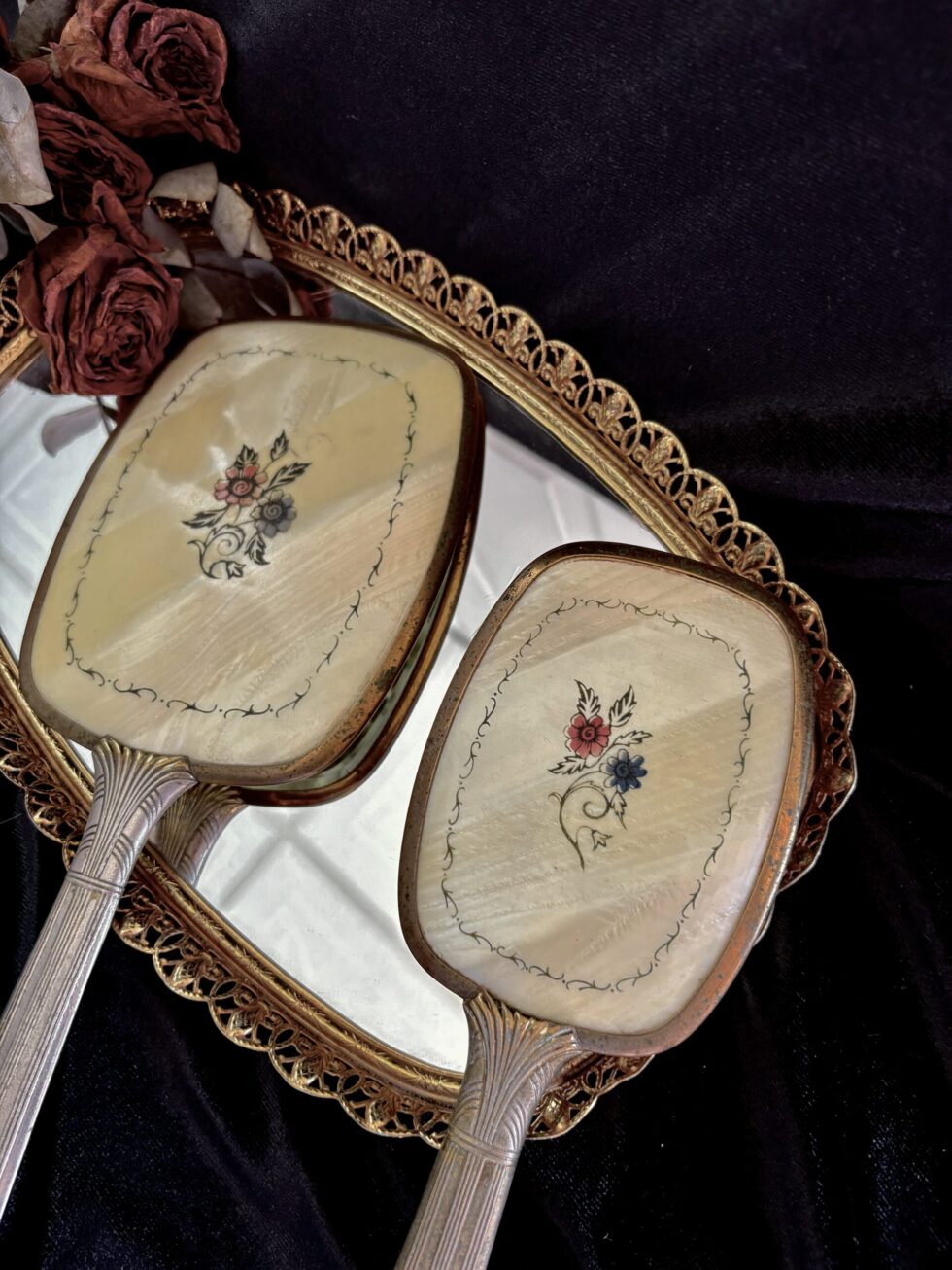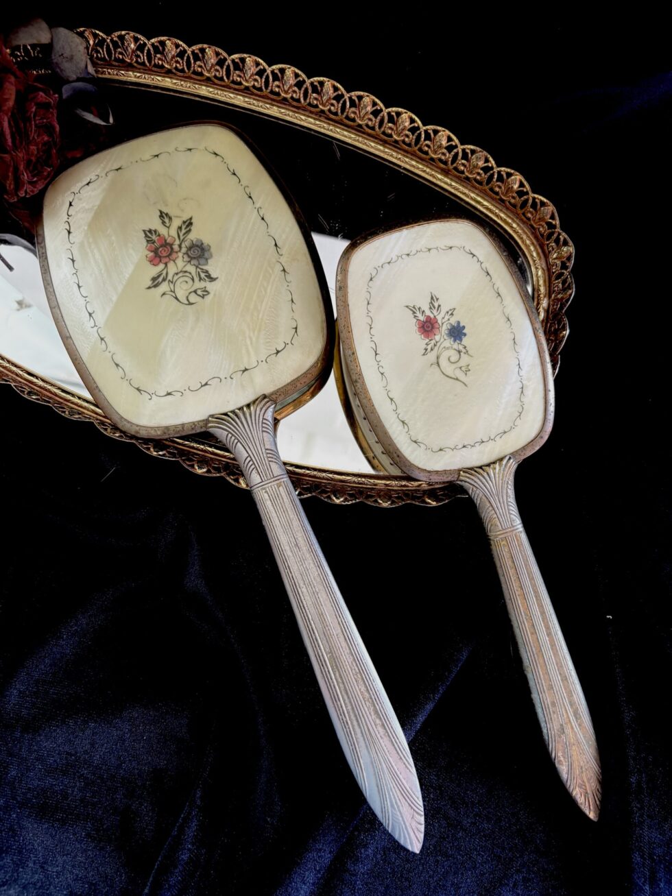 Ambas piezas tienen un reverso de celuloide con acabado de imitación de madre perla y detalle de marco de enredaderas de flores en azul y rojo.