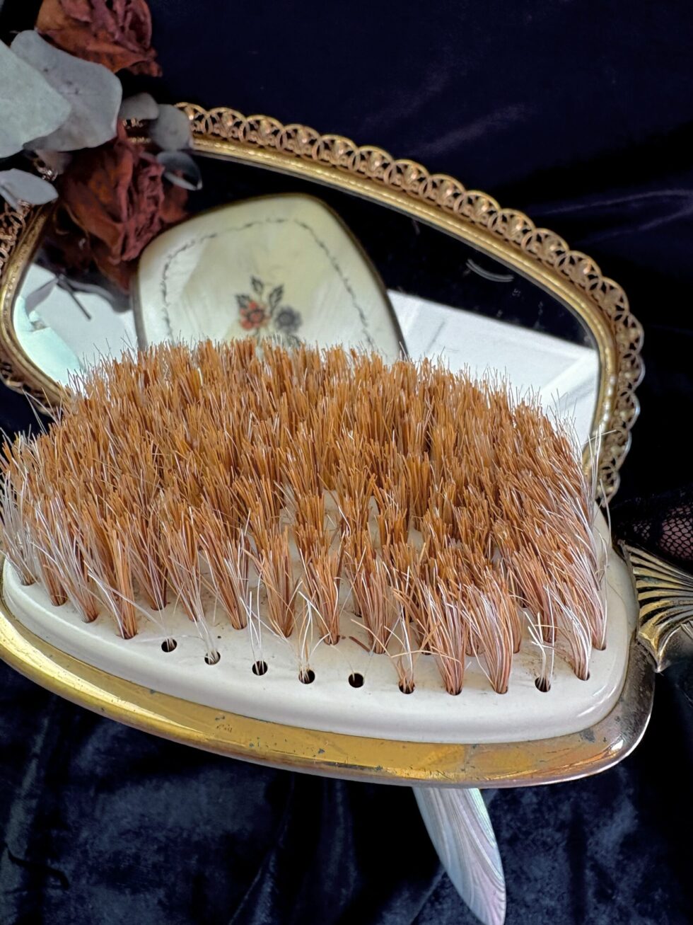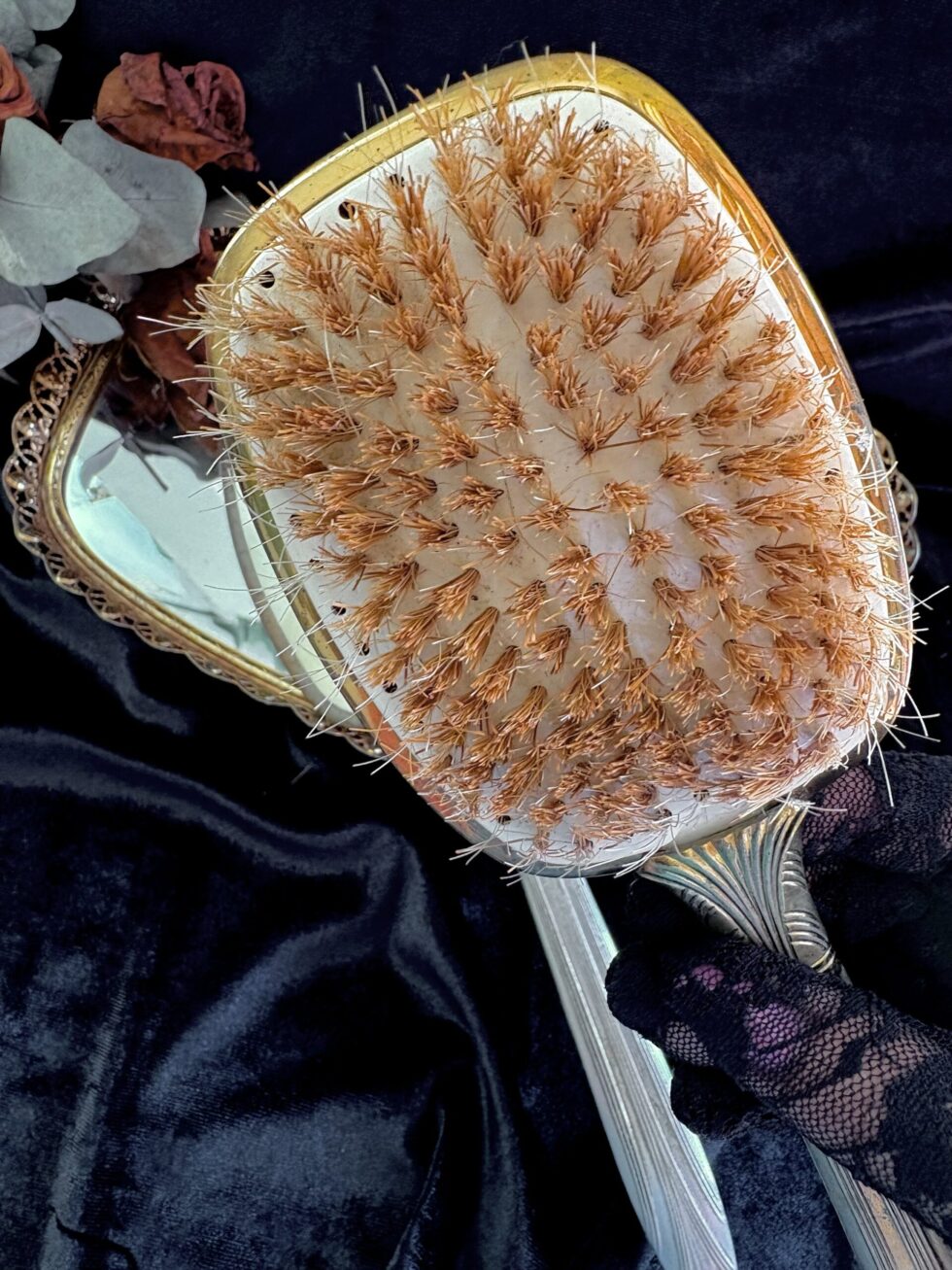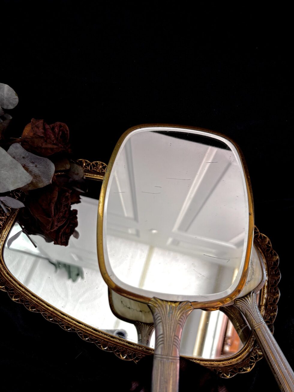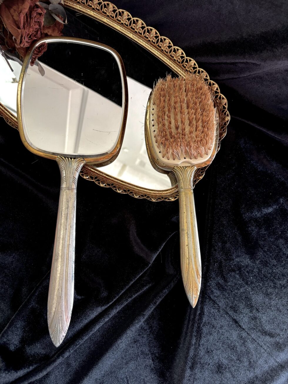 Incluye un espejo de mano (33cm) estilo art deco con mango decorado en relieves geométricos y cepillo de mano de cerdas naturales (25.5cm).