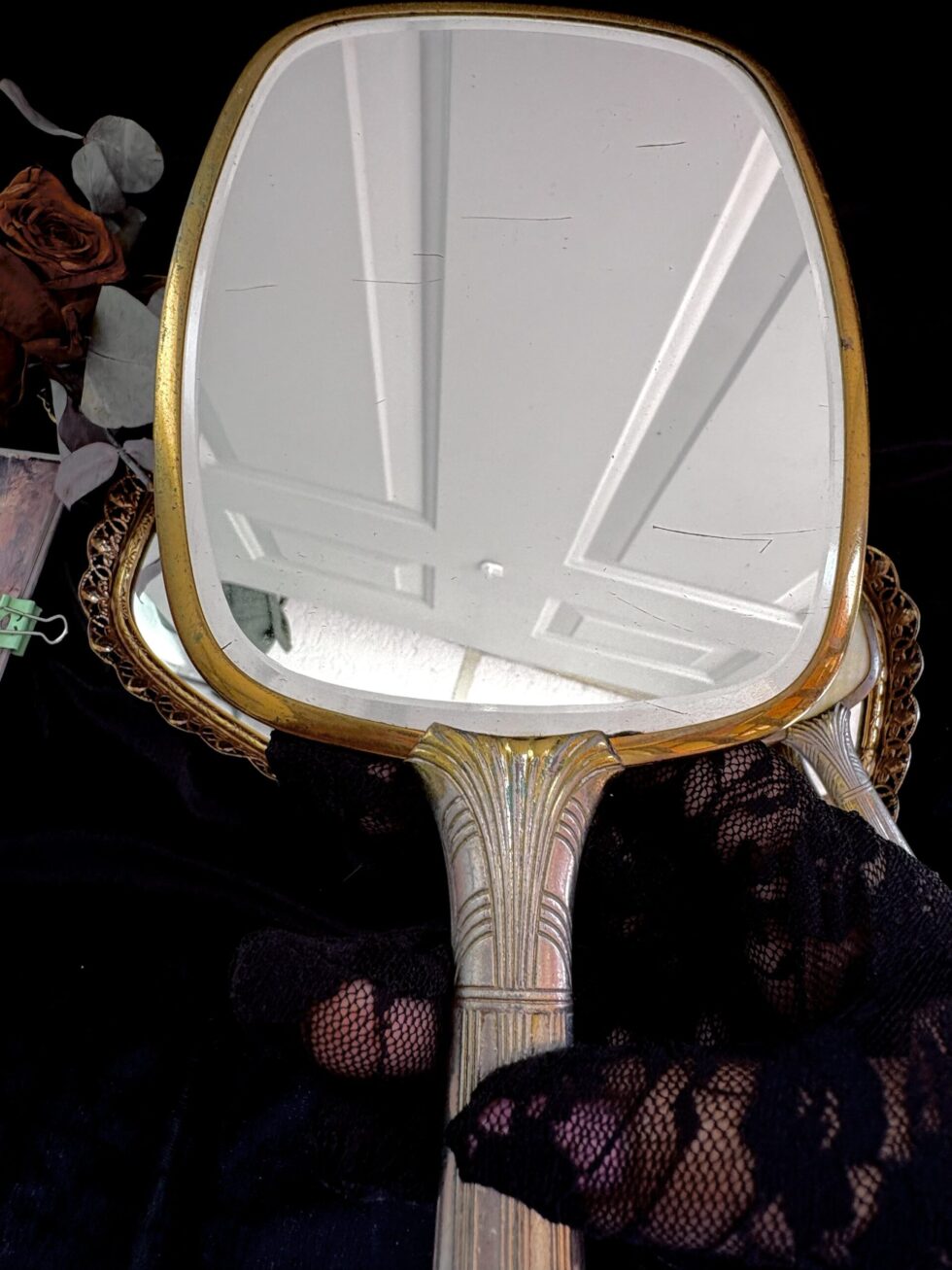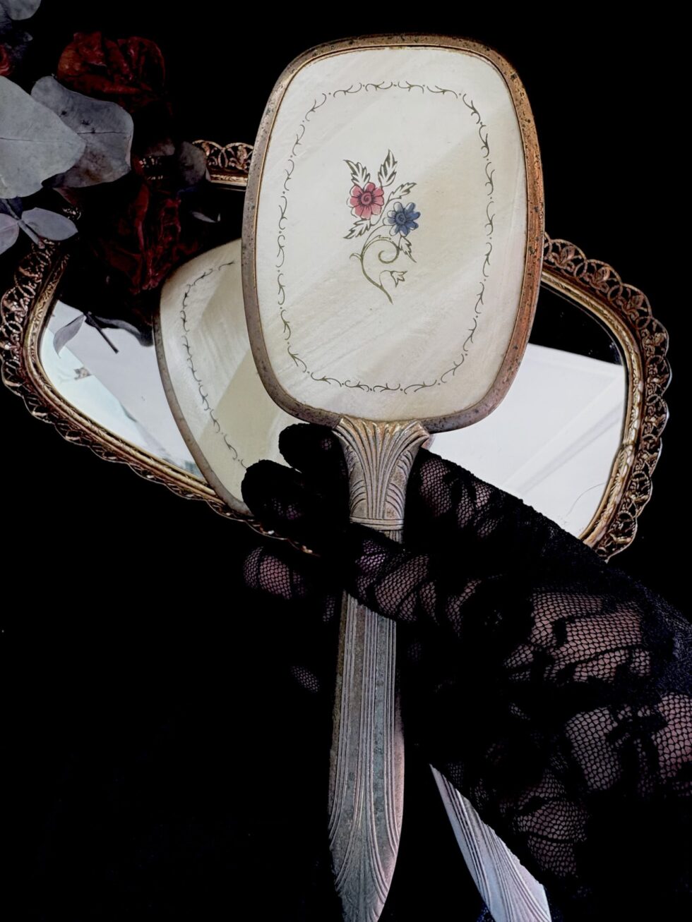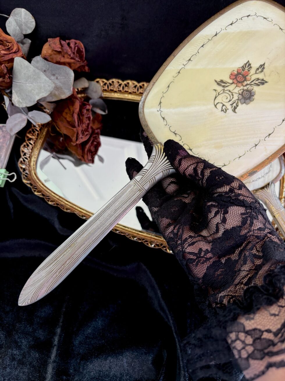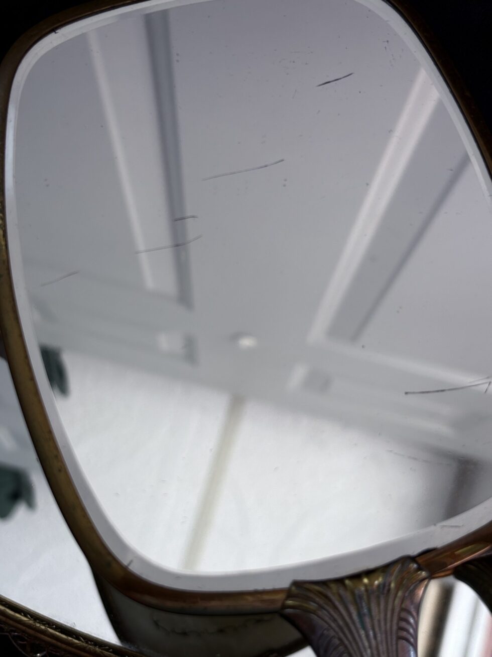 Incluye un espejo de mano (33cm) estilo art deco con mango decorado en relieves geométricos y cepillo de mano de cerdas naturales (25.5cm).