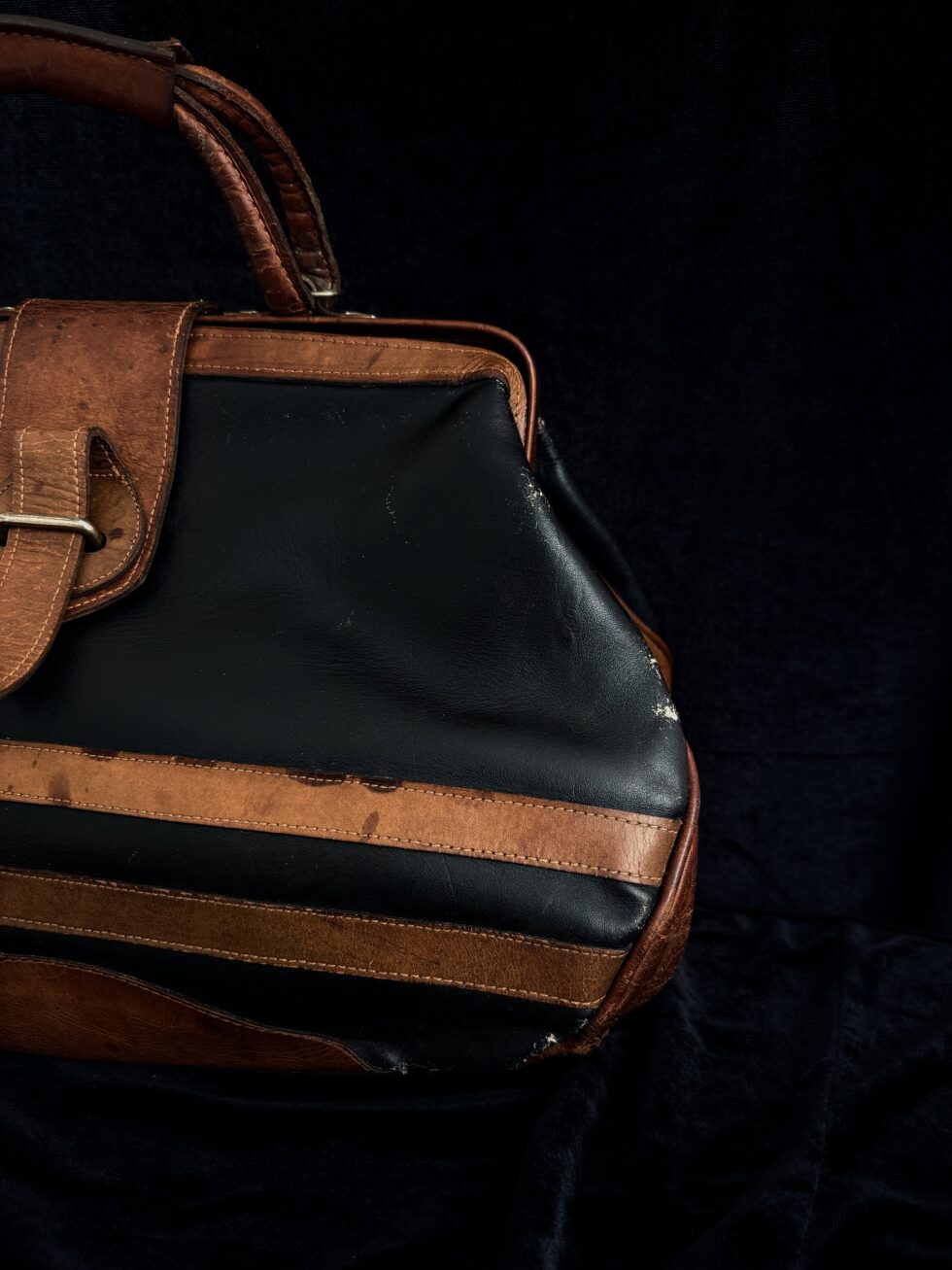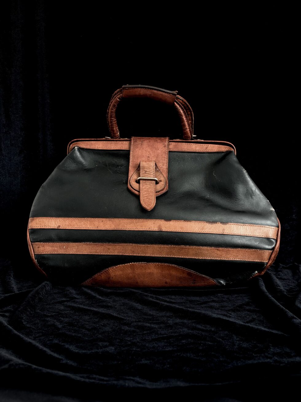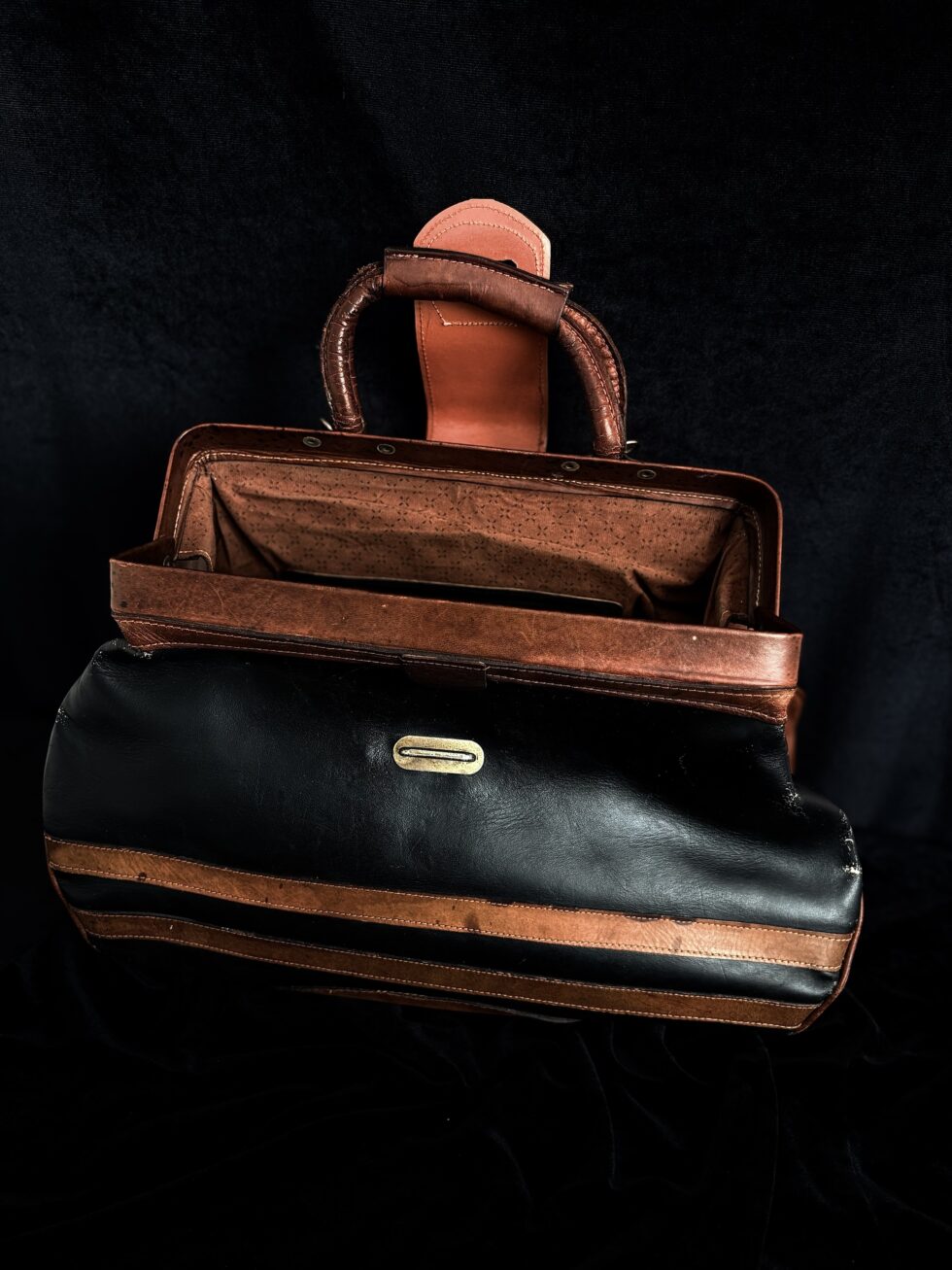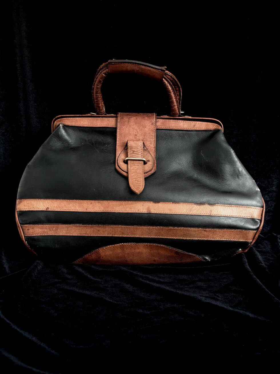 Auténtica doctor bag de los años 70s en cuero genuino bicolor negro y cognac. Esta pieza representa la elegancia del estilo preppy americano de mediados de siglo, con su característico diseño de franjas horizontales y manufactura artesanal.