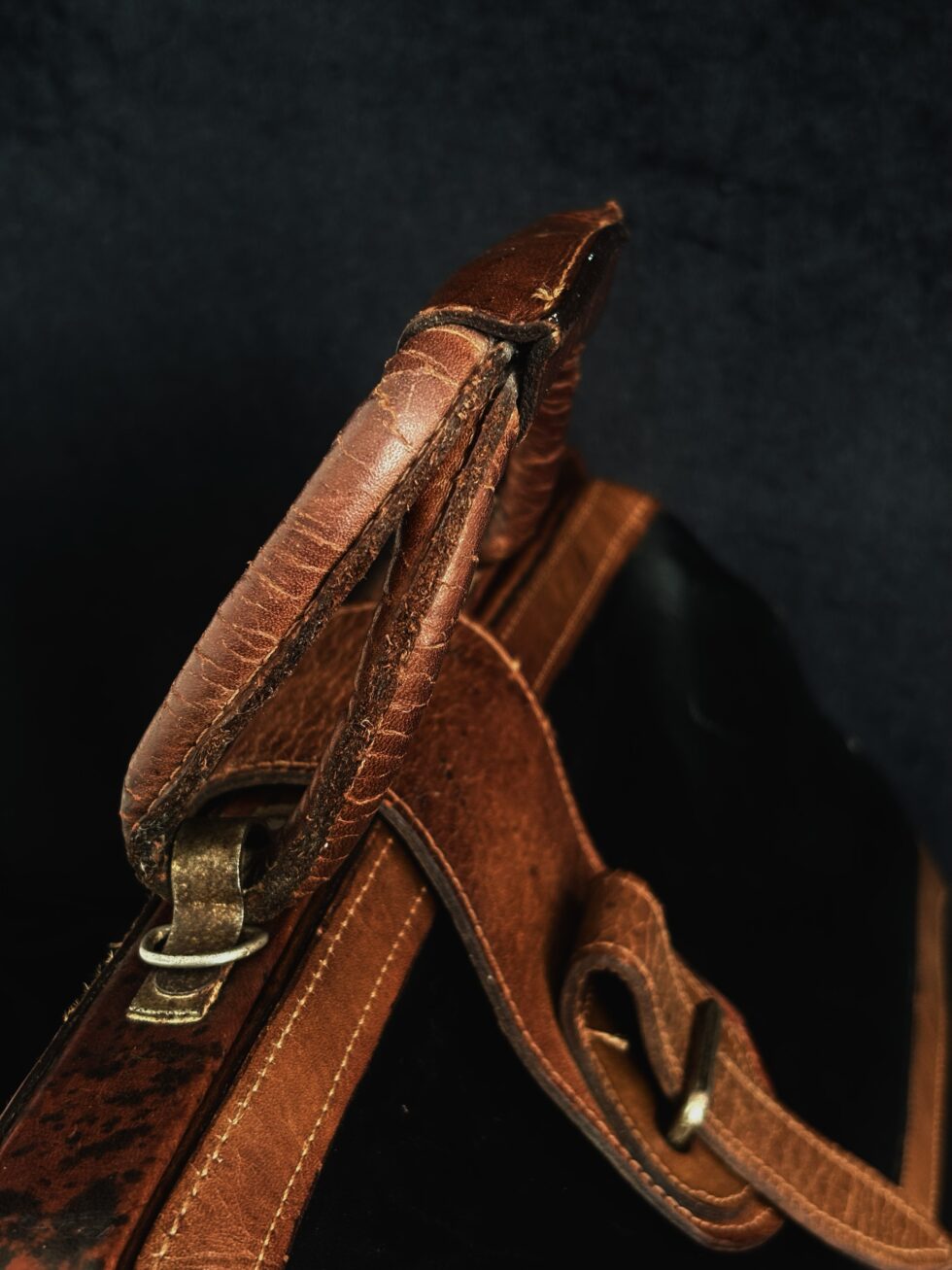 El cierre metálico YKK original y el broche de cuero con hebilla demuestran la calidad de la marroquinería de época. Estas maletas médicas fueron diseñadas para profesionales con boca amplia tipo “kiss lock” para acceso rápido, hoy codiciadas como piezas statement únicas.