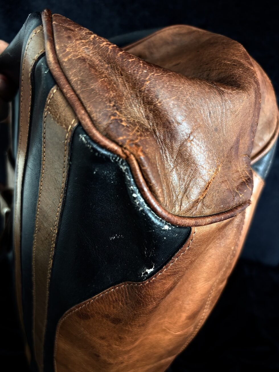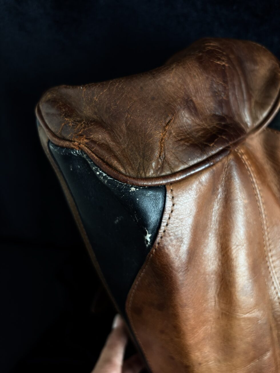 Presenta desgaste natural que añade carácter auténtico y pátina de década en el cuero. Tiene una pequeña abertura en uno de los costados mostrado en fotos. Interior espacioso con estructura rígida. Hardware en tono dorado.
