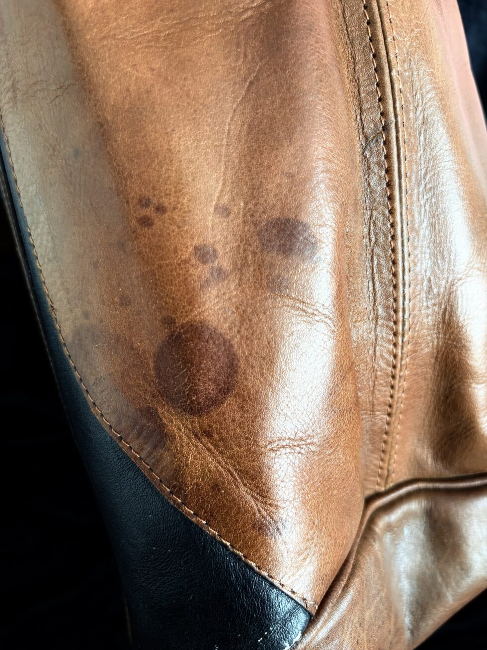 Auténtica doctor bag de los años 70 en cuero genuino bicolor negro y cognac. Diseño preppy americano con cierre YKK original.