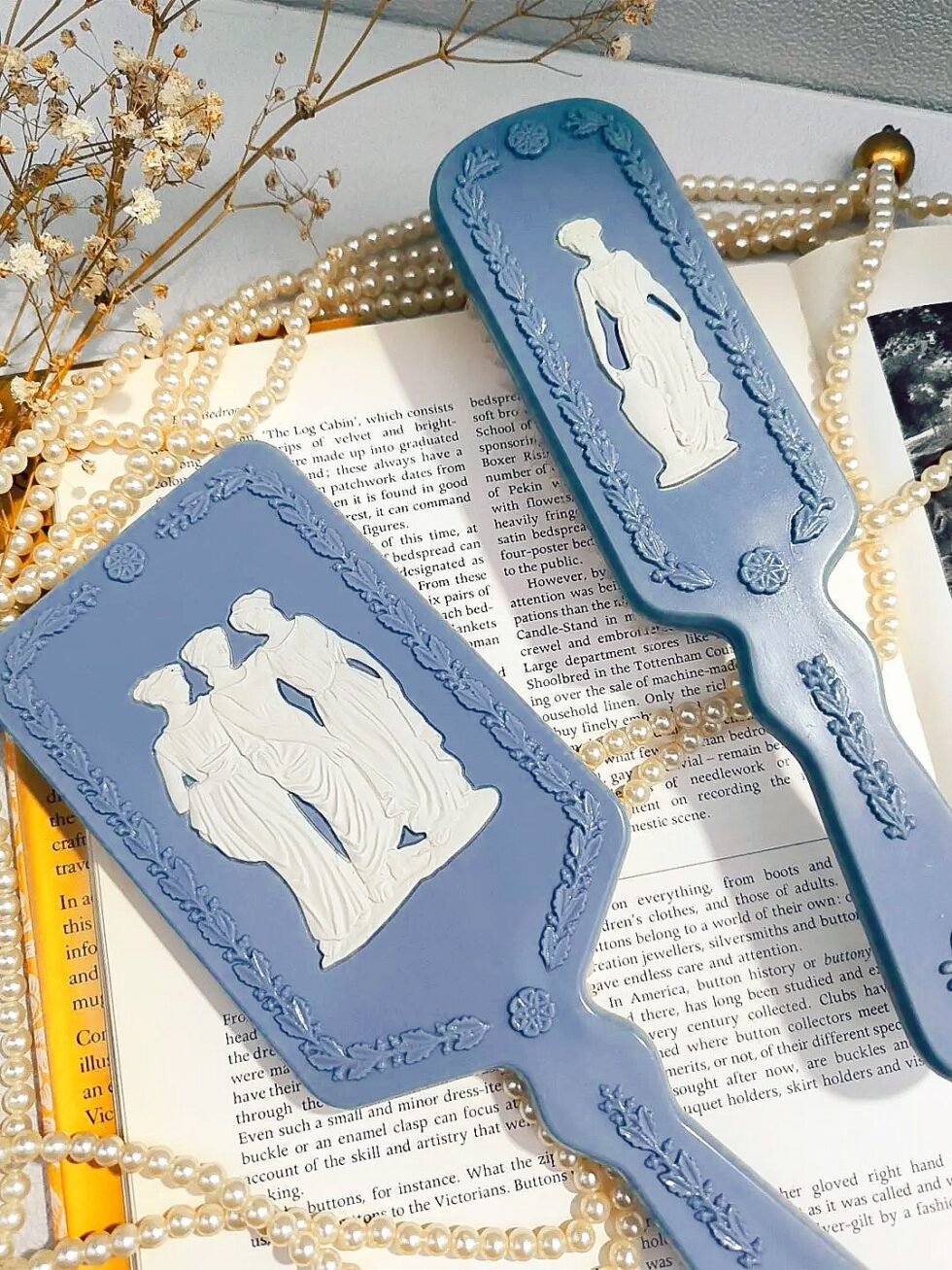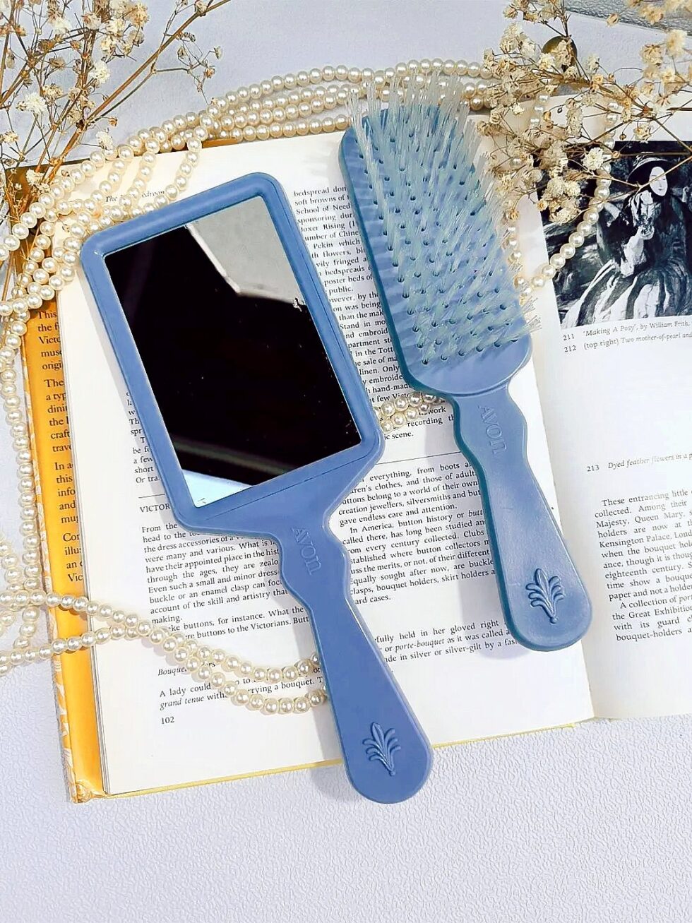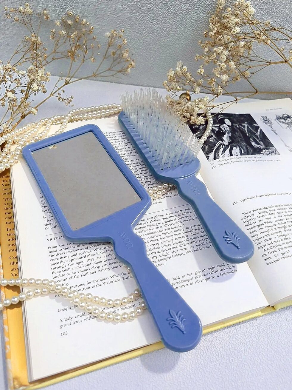 Elegante espejo y cepillo de mano marca Avon Avonshire Blue.